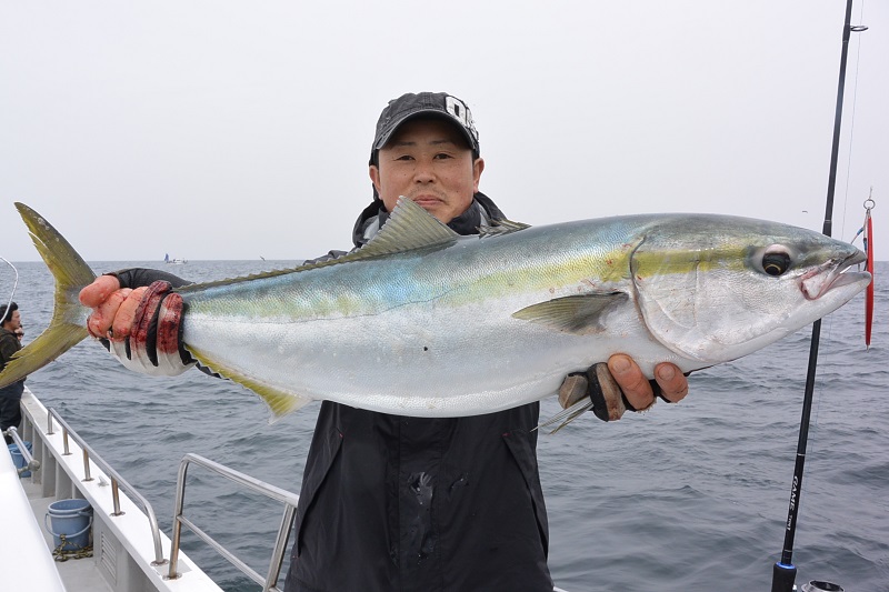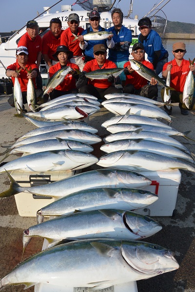 | 28日(土曜日)GW初日鰤爆釣!!9,26kg頭に42本、メジロ63本、マダイなど。 1日中鳥山でした。はじめは感度入らず??でしたが徐々に感度通過し出し夕方には鰤連発!怒涛のヒットになりました。我船団は西に走りましたが港も前でも爆釣していた様子、ポイント選択迷いますね。ジギングトーナメント鰤の部暫定トップ。大きなのが回っています。トーナメント参加忘れずに。 5人共鰤が掛かっています!ネットが間に合わない。 |